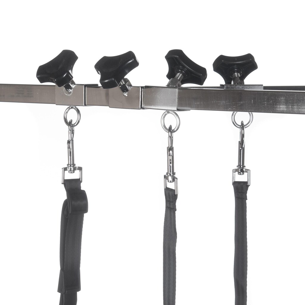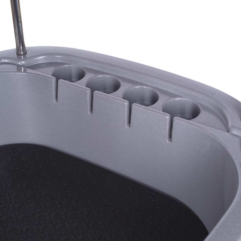 The adjustable height is easily controlled with foot pedals, which provides an ergonomically correct working position for groomers and owners. Three leashes on the arm ensure that the animal is kept in place during bathing and treatment. The tub also has storage for cosmetic bottles along the edge and a non-slip bottom for extra safety.